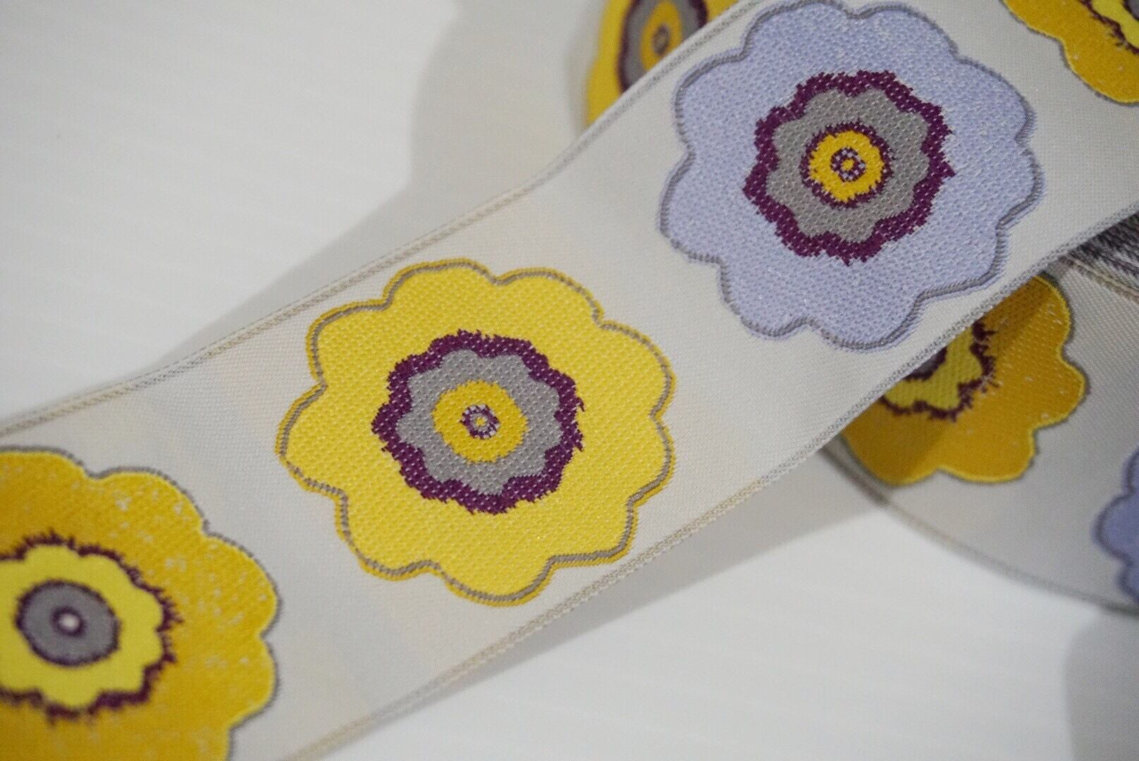 薄いグレーと紫の中間色の地に黄色、紫のプリムローズが刺繍されています。